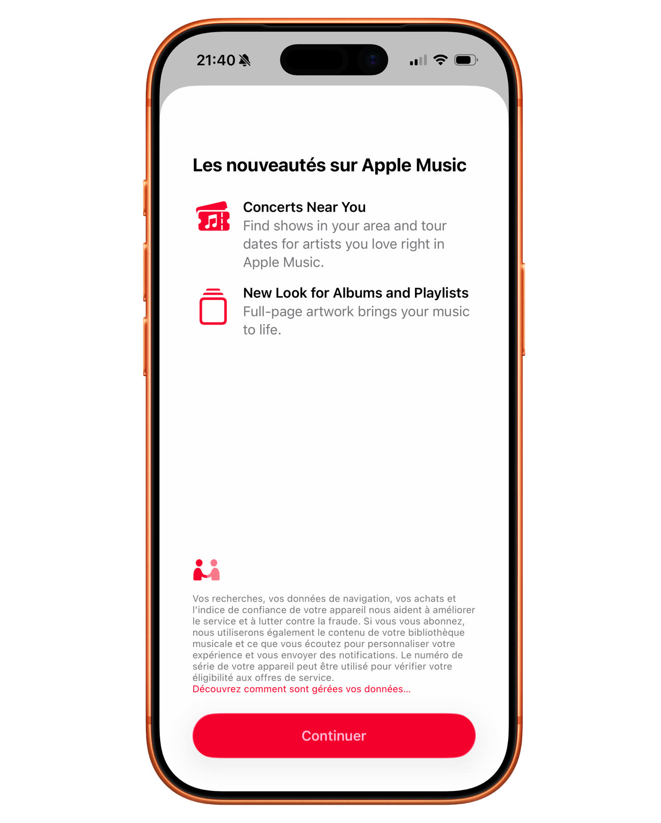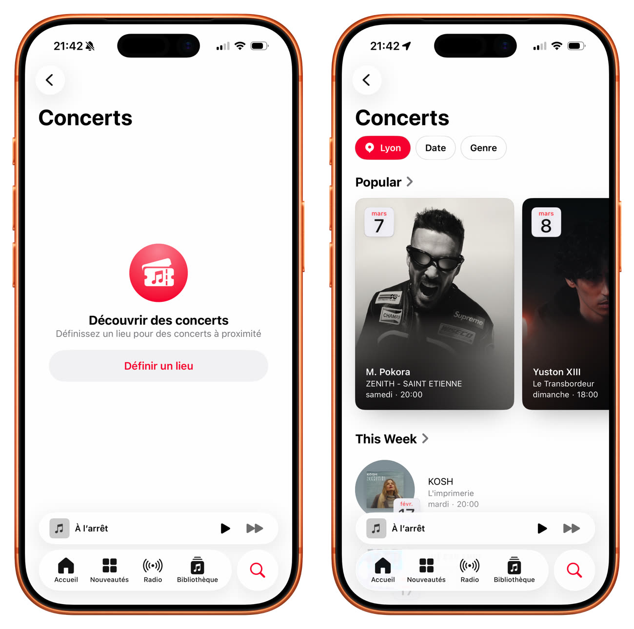 Apple Music peut maintenant mettre en avant les concerts se tenant près de chez vous, ou même ailleurs. Dans l’onglet Rechercher, il faut sélectionner la section Concerts, puis autoriser l’accès à la localisation ou saisir manuellement un lieu.