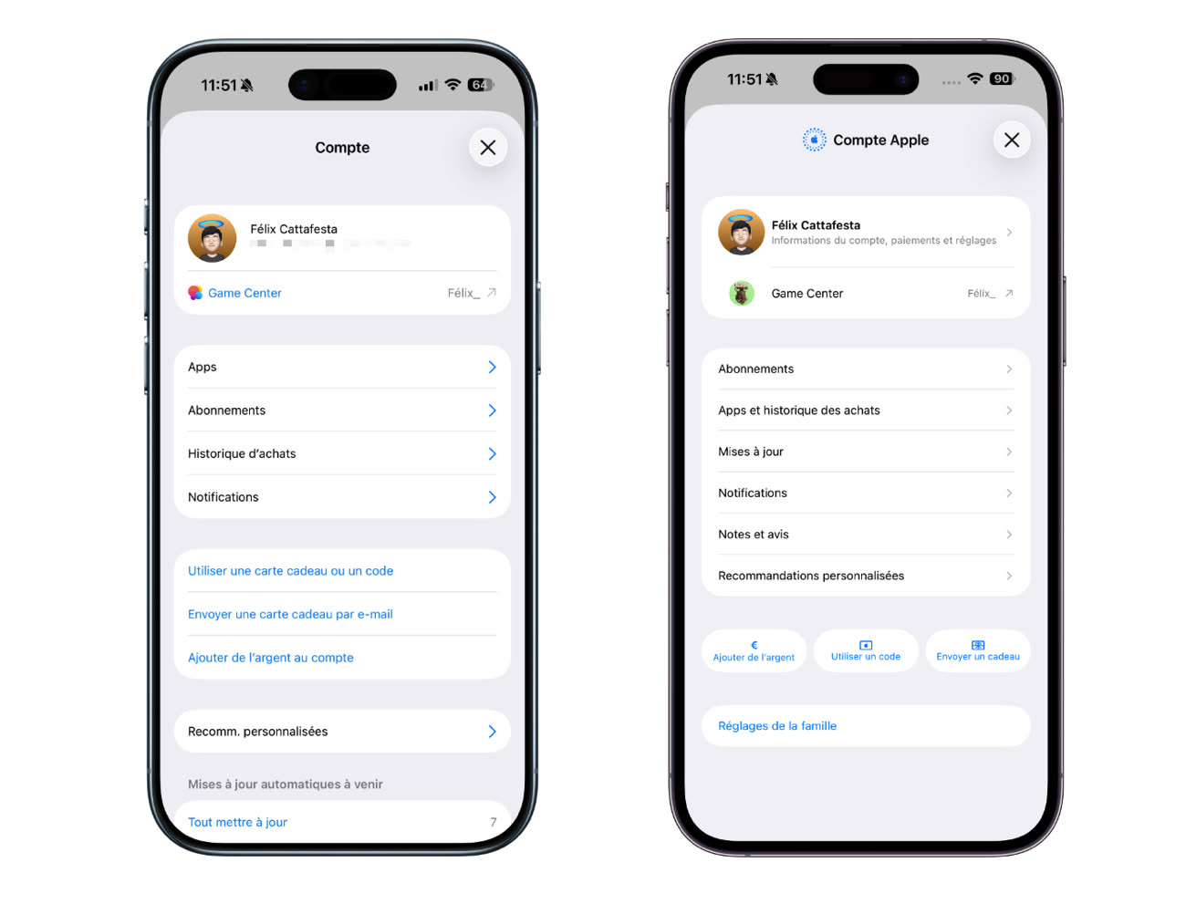 Plus anecdotique, le panneau Compte qui s’ouvre quand on touche son avatar a été réorganisé. Aucune nouvelle option n’a été ajoutée, il s’agit simplement d’une présentation revue. Ce changement s’inscrit dans une refonte plus large déjà visible dans d’autres applications Apple, comme l’App Store ou TV.