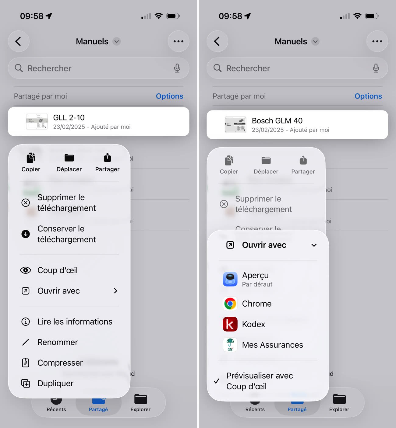 Fort heureusement, Apple a prévu une solution si vous préfériez Coup d’œil. Si vous avez un iPad avec un clavier, vous pouvez naturellement utiliser le raccourci dédié à la fonction, à savoir la barre espace. Même sans cela, Fichiers sous iOS 26 propose de choisir une app par défaut. Pour cela, trouvez un fichier dans le format de votre choix, un PDF par exemple. Affichez son menu contextuel avec un tap prolongé sur l’écran ou bien un clic secondaire avec un trackpad ou une souris et dans le menu « Ouvrir avec », cochez l’option « Prévisualiser avec Coup d’œil ».