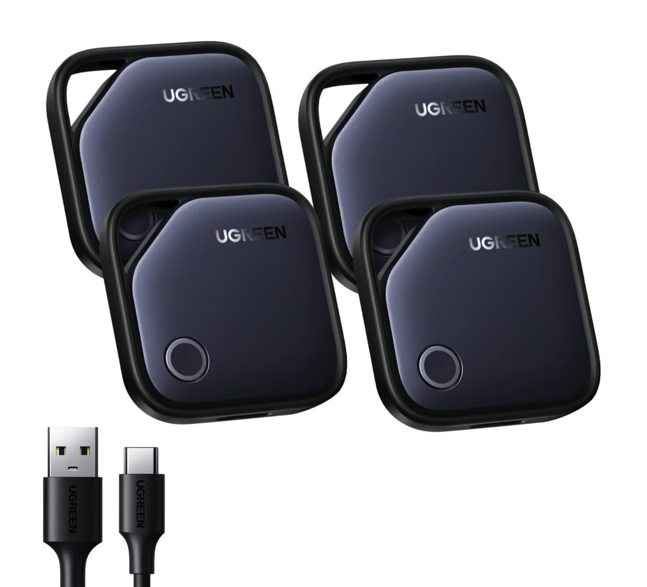 Contrairement à beaucoup de balises concurrentes, ces traceurs ne fonctionnent pas avec une pile bouton, mais avec une petite batterie intégrée. Ugreen annonce une autonomie d’environ un an, avec une recharge via un simple câble USB-C. Un câble USB-A vers USB-C est d’ailleurs fourni dans la boîte.