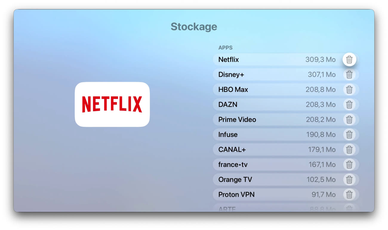 Si tvOS ne met pas cette donnée en avant, le système propose tout de même quelques outils pour gérer le stockage. On peut faire en sorte que les apps inutilisées soient automatiquement déchargées (option dans Réglages > Apps), ce qui les supprime tout en conservant leurs données. Et dans Général > Gérer le stockage, on peut identifier les apps les plus volumineuses et les supprimer rapidement.