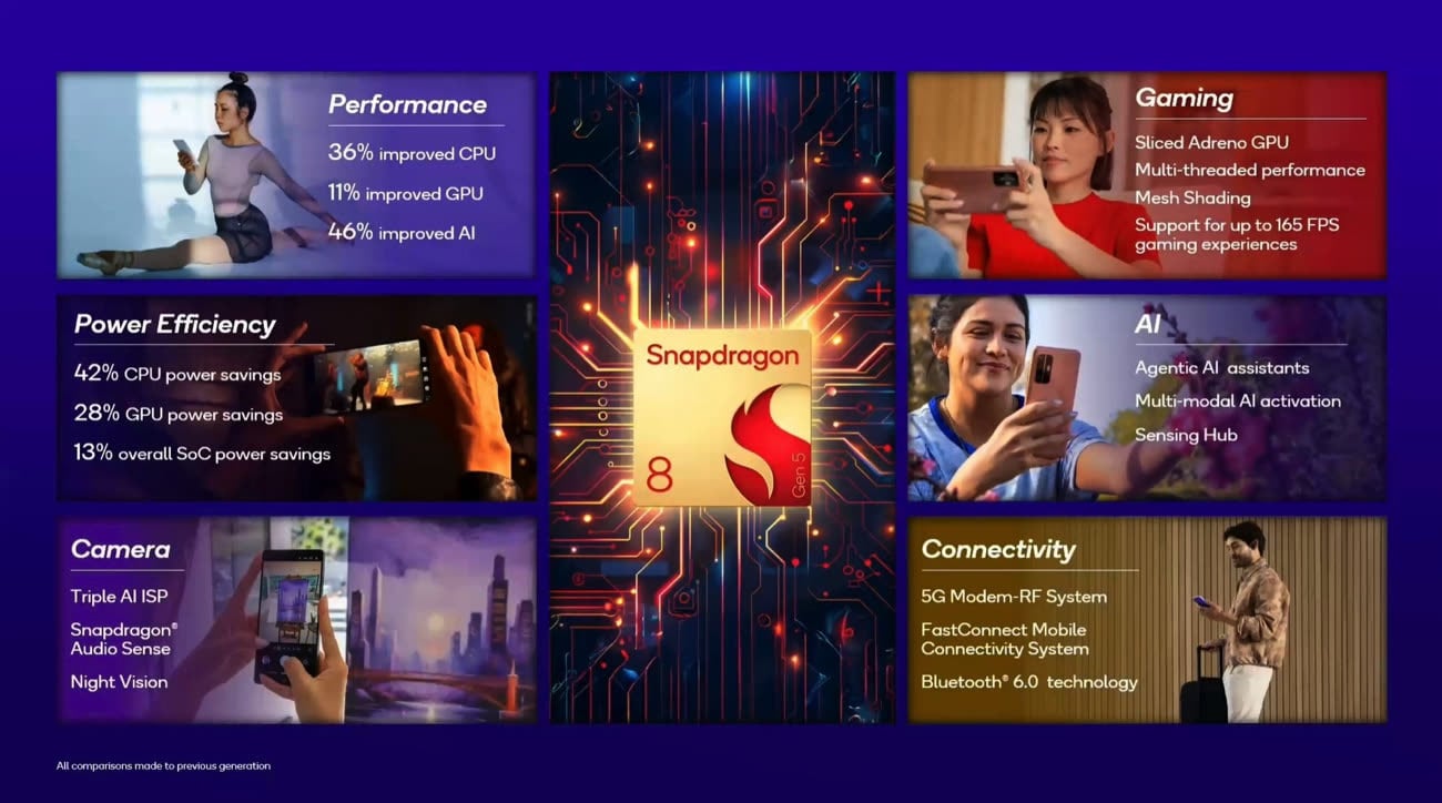 Au vu des différences, cette version est donc en retrait par rapport au Snapdragon 8 Elite Gen 5, mais devrait garder des performances de haut vol. Qualcomm tend à comparer la puce au Snapdragon 8 Gen 3 (il n'y a pas de Gen 4), qui était basé sur des cœurs issus de chez ARM.