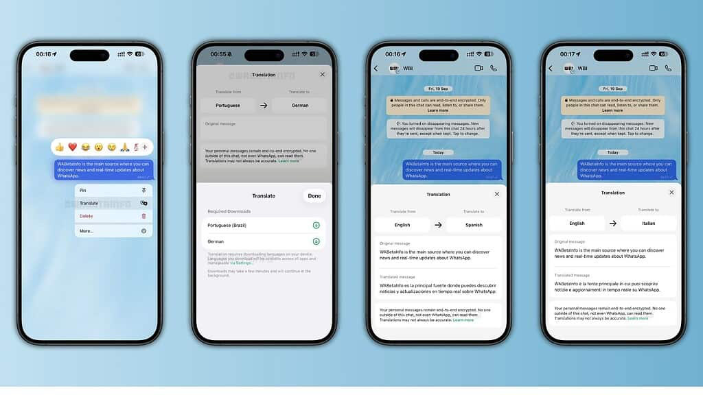 Dans son communiqué, WhatsApp indique que tout se fait localement et indique que les 19 langues actuellement prises en charge par Traduire seront au programme. Elle glisse un lien vers la documentation d’Apple, qui semble confirmer l’utilisation des API de Cupertino. Comme tout se passe en local, il faudra télécharger la langue cible ou source d’un message avant de faire quoi que ce soit. L’entreprise affirme ne pas pouvoir voir le texte traduit.