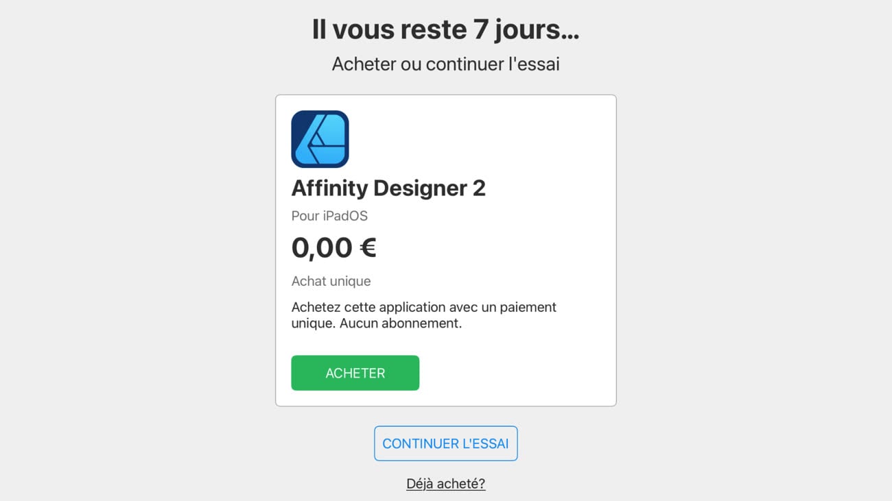 Coup de com ou erreur interne ? La suite Affinity est actuellement gratuite sur iPad au lieu de 20 € par logiciel en temps normal. Vous pouvez ainsi obtenir Designer 2, Photo 2 ou Publisher 2 sans avoir à entrer votre numéro de carte bleue. Pour en profiter, il suffit de télécharger l'app avant de vous créer un compte Affinity et d’accepter un essai de 7 jours. Un achat in-app à 0 € devrait vous être proposé dans la rubrique « Mon compte » en bas à gauche.