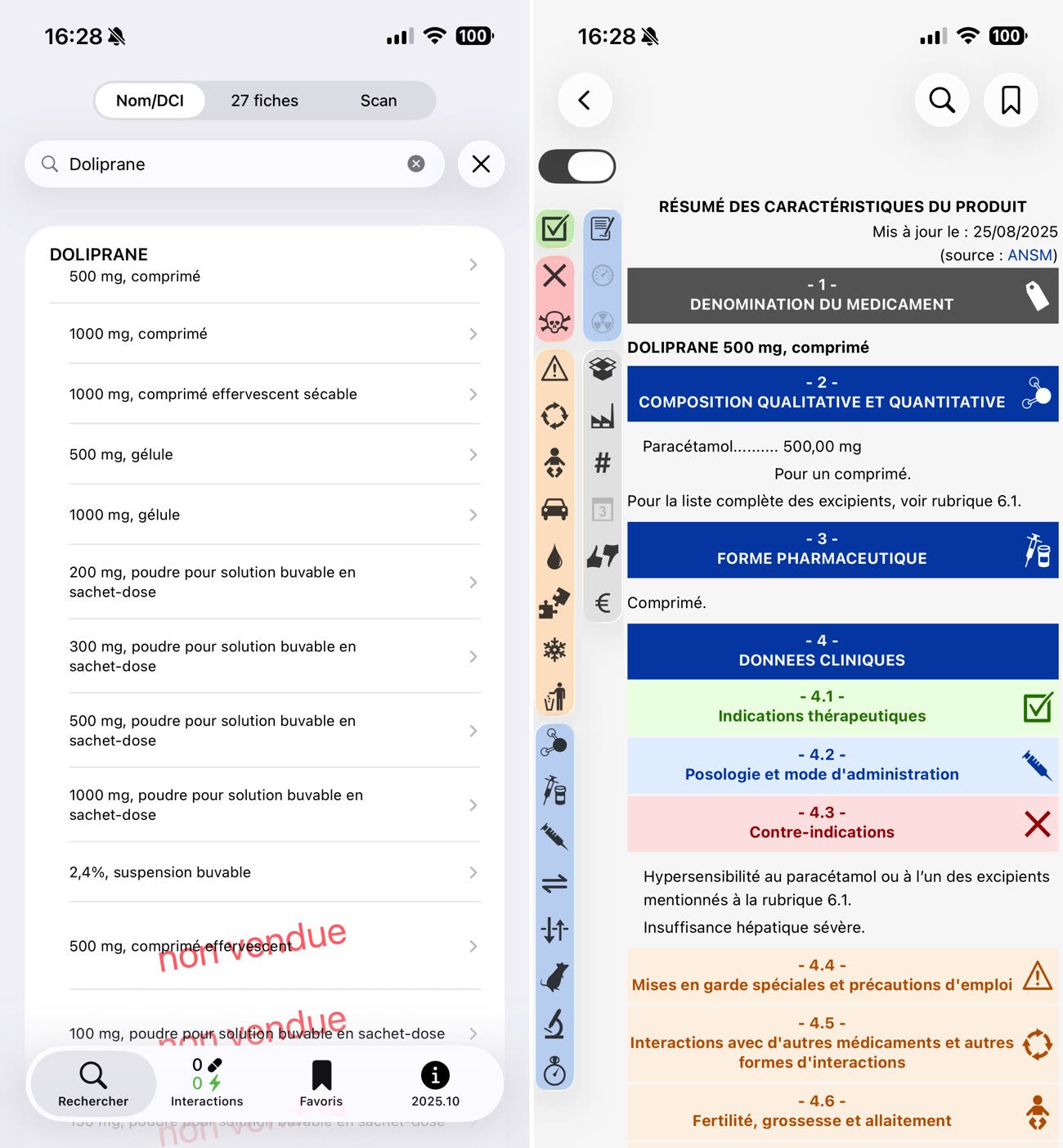 Lancée il y a bientôt 15 ans, l’application Médicaments continue son petit bonhomme de chemin. Ce programme destiné aux professionnels de santé permet de consulter les informations officielles sur plus de 12 000 médicaments vendus en France, comme leur composition, prix, effets, et taux de remboursement. Elle sert aussi à vérifier les interactions entre plusieurs traitements et fonctionne même sans connexion Internet. L’app est désormais prête pour iOS 26 et a été complètement réécrite en SwiftUI pour l’occasion.