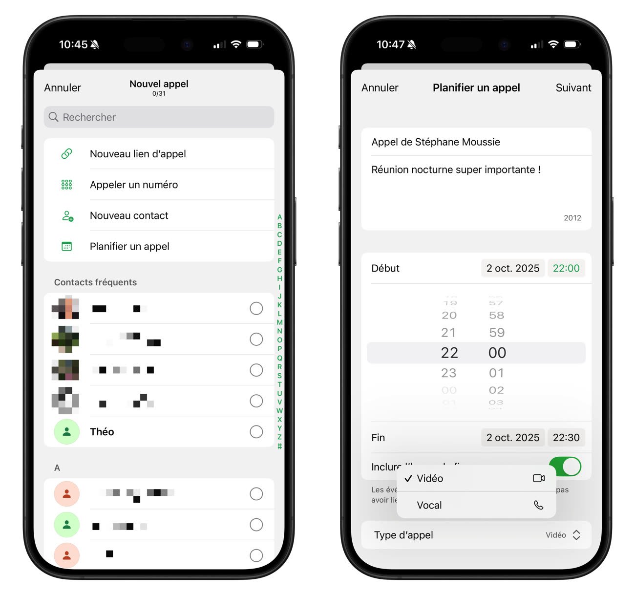 Dans l’onglet Appels, il faut appuyer sur le bouton +, puis sur l’option « Planifier un appel ». Apparait alors une fenêtre dans laquelle on inscrit un titre, une description, l’heure et le type d’appel (audio ou vidéo). L’invitation peut ensuite être envoyée à un contact ou un groupe, avec la possibilité de l’ajouter directement à son calendrier.