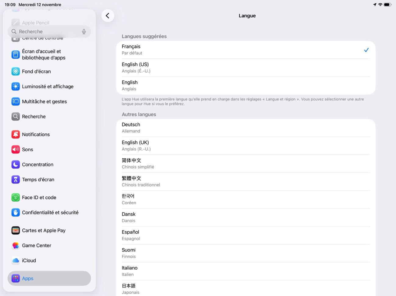Il n'est pas nécessaire de mettre totalement iOS ou iPadOS en anglais : il est possible de ne passer que l'app Hue dans cette langue. Dans Réglages > Apps > Hue > Langue, il suffit de choisir English (US) plutôt que le français. Vous pouvez revenir en français une fois l'automatisation ajoutée.
