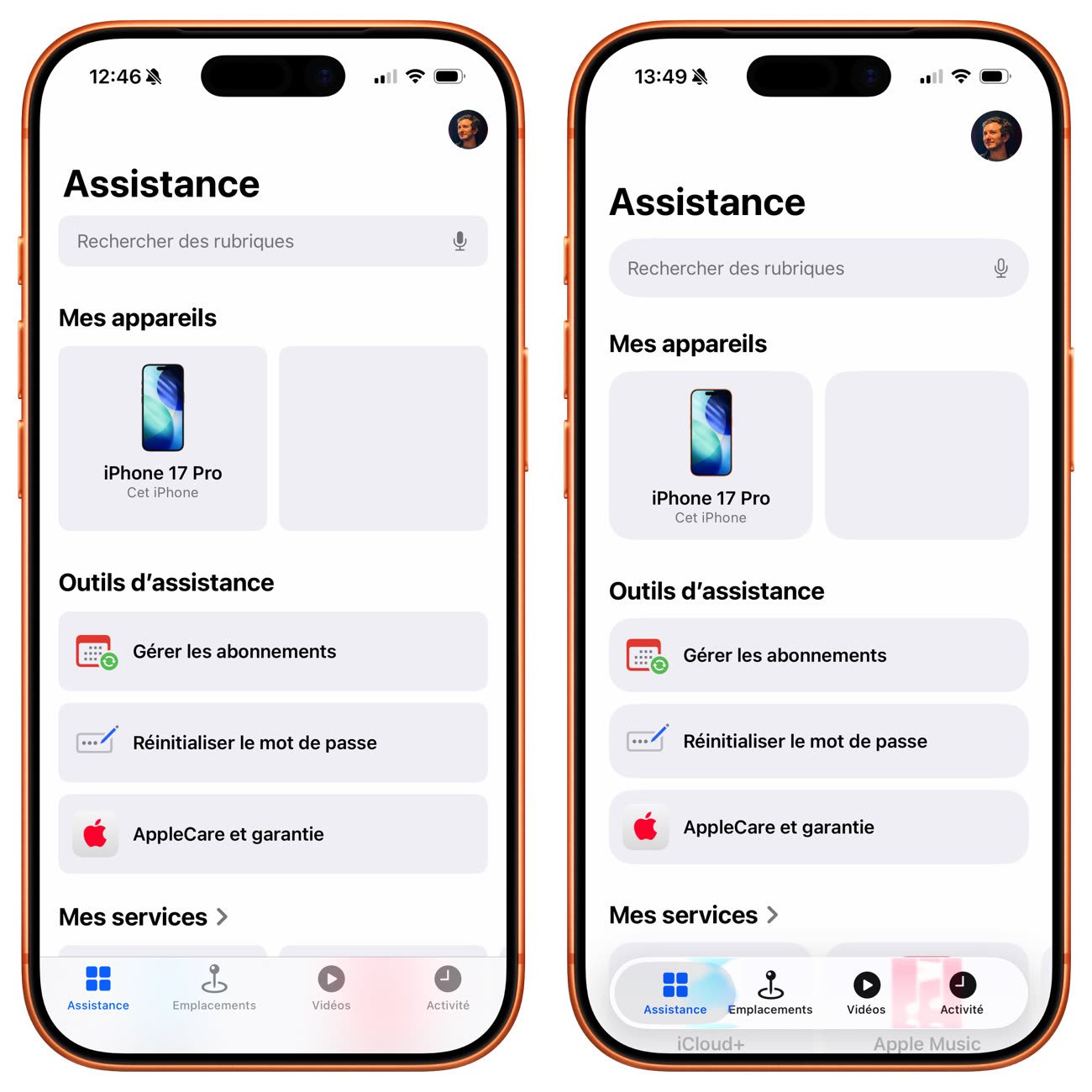 La différence est plus nette dans Assistance Apple : la barre d’onglets n’est plus collée aux bords de l’écran et elle est plus transparente qu’avant.