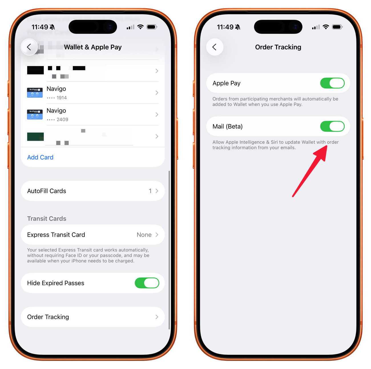 En passant un iPhone complètement en anglais, nous avons vu apparaitre la nouvelle option : Settings > Wallet & Apple Pay > Order Tracking > Mail (Beta). Faute de commande récente, nous n’avons pas pu confirmer si l’ajout automatique fonctionnait bien. Mais une chose est sûre : pour que cela fonctionne en français, il faudra attendre encore un peu.