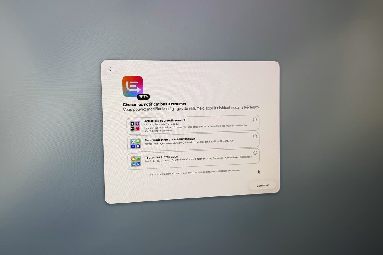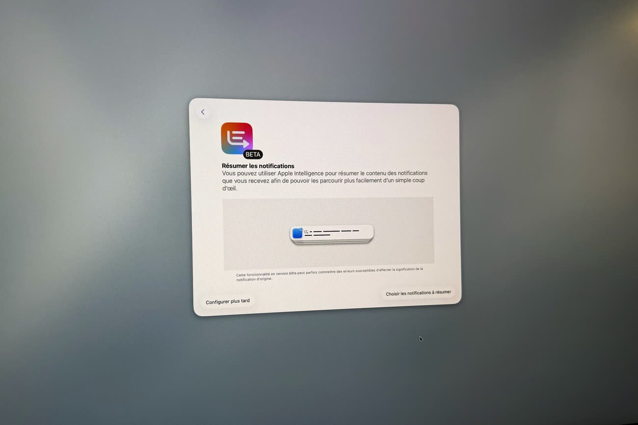L’une des nouveautés d’iOS 26.1 et de macOS 26.1 sorties en version finale en début de semaine est visible durant le processus de configuration initiale qu’Apple affiche après installation des mises à jour. Sur les iPhone, iPad et Mac compatibles avec Apple Intelligence, un panneau demande à l’utilisateur s’il souhaite (ré)activer les résumés de notifications. On peut choisir de ne pas le faire immédiatement grâce à un bouton « Configurer plus tard » (un bel exemple de dark pattern, au passage) ou alors le système propose ensuite de choisir les catégories d’apps pour lesquelles les résumés seront activés.