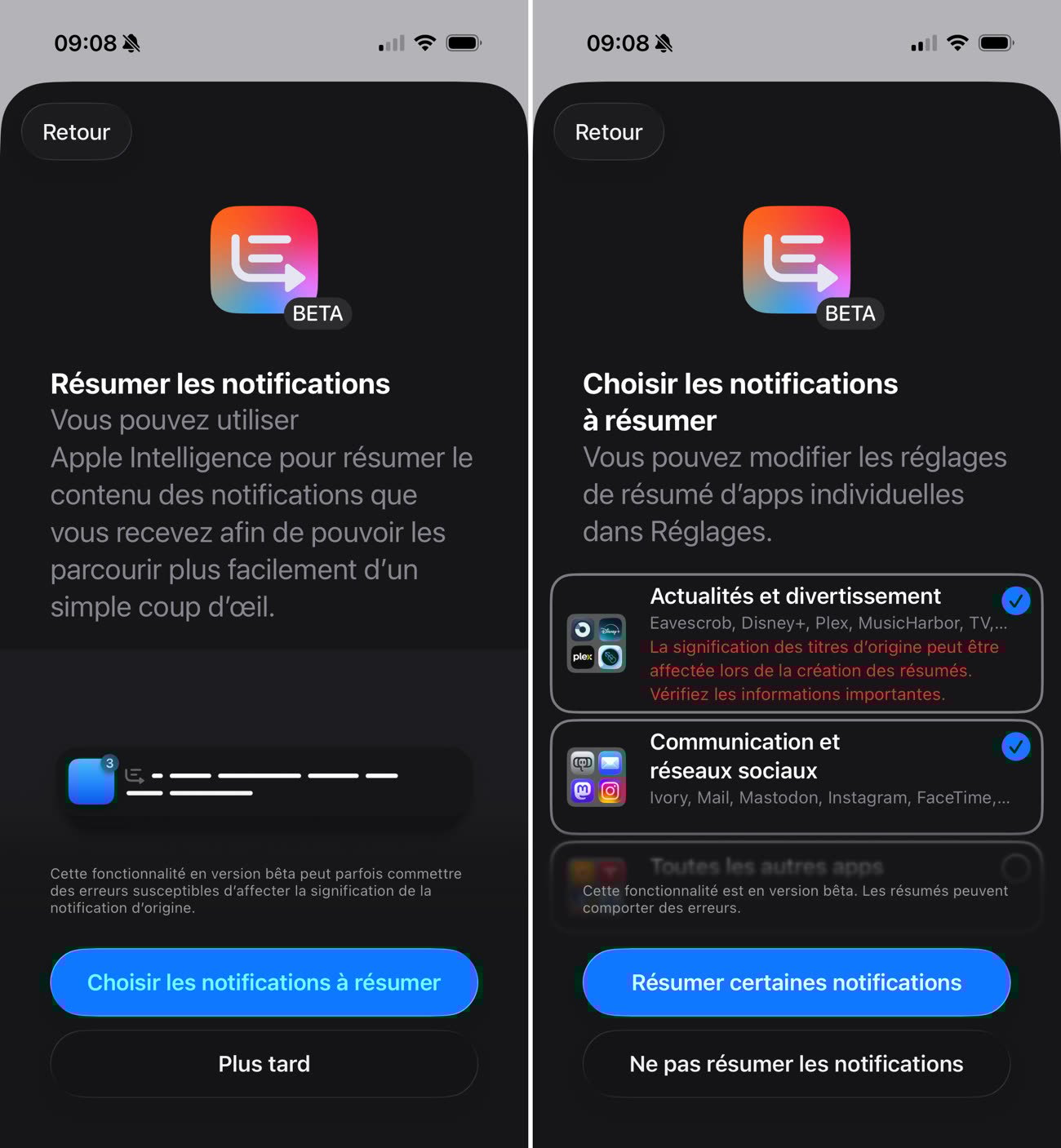 Depuis, Apple a amélioré son modèle de langage et, en théorie du moins, le résumé des notifications ne devrait plus faire d’erreurs aussi grossières que l’an dernier. C’est sans doute pour cette raison que la Pomme incite ses utilisateurs à réactiver la fonctionnalité, avec l’espoir qu’on lui laisse une deuxième chance. Cela dit, la fonction reste marquée comme bêta dans l’interface, avec une mention qui dit bien que « les résumés peuvent comporter des erreurs », ce qui n’est pas rassurant. On peut choisir de résumer les apps d’actualité, même si un message d’avertissement en rouge est présenté pendant la configuration, contrairement aux autres catégories d’apps.