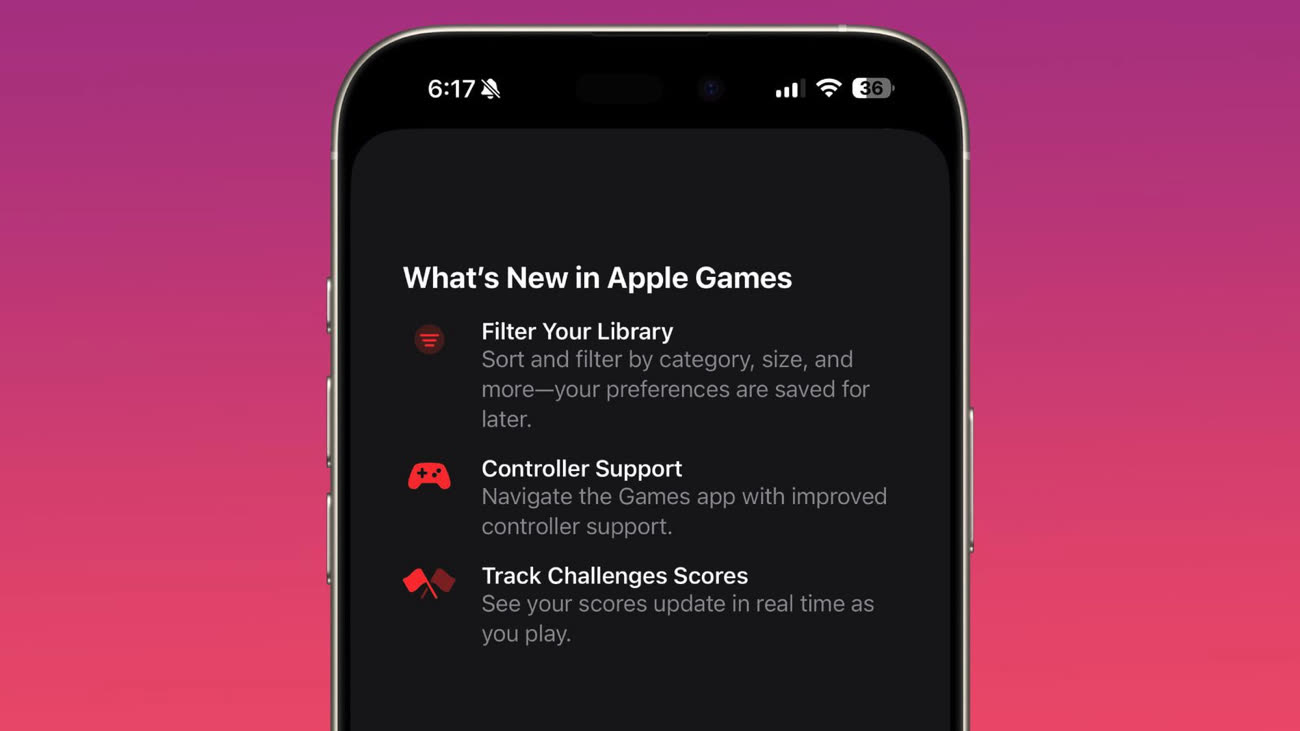 Une nouvelle fenêtre d’accueil apparaît dans l’app Jeux pour présenter les nouveautés d’iOS 26.2. Parmi les ajouts annoncés : des options de filtrage pour la bibliothèque de jeux, une meilleure navigation à la manette au sein de l’app, ainsi que la mise à jour en temps réel des scores de défis pendant les parties.