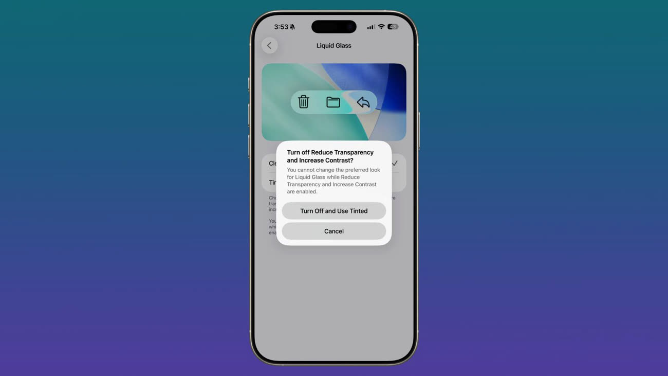 Lorsque vous activez la nouvelle option Liquid Glass « Tinted », qui réduit les effets de transparence, iOS affiche un avertissement : ce mode ne peut pas être utilisé en même temps que les options d’accessibilité « Réduire la transparence » et « Augmenter le contraste ».