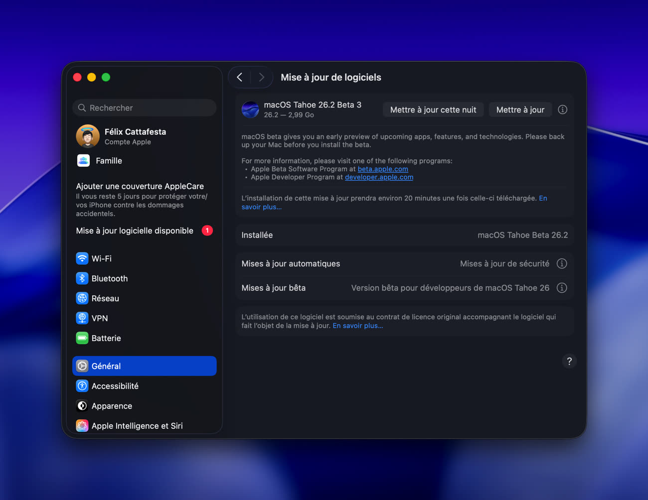 Pour installer cette troisième bêta d’iOS 26.2, il faut ouvrir l’app Réglages, aller dans Général, puis sélectionner Mise à jour logicielle. Il est nécessaire d’activer les bêta et d’être connecté avec un compte développeur pour que la version apparaisse. Le chemin est identique pour macOS Tahoe 26.2.