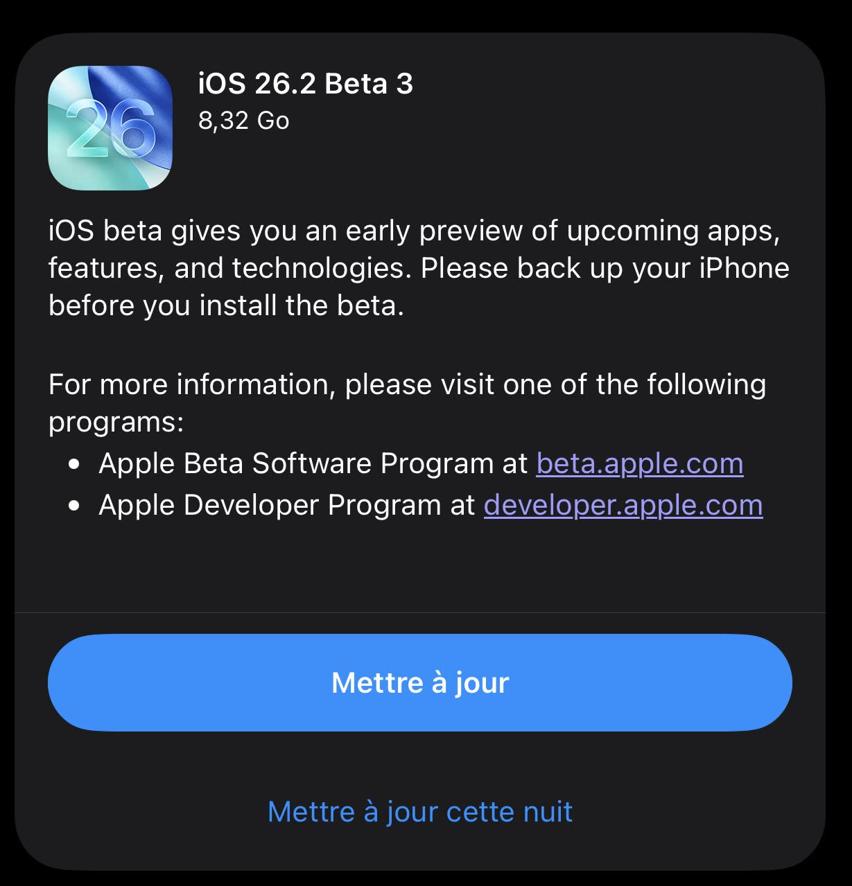 Amis développeurs, préparez-vous : c’est le soir des bêtas ! Apple vient en effet de publier une troisième bêta pour iOS et iPadOS 26.2. macOS, tvOS et watchOS 26.2 sont également de la partie. Nous allons installer tout ça et vous tiendrons au courant de ce qu’il y a de neuf.