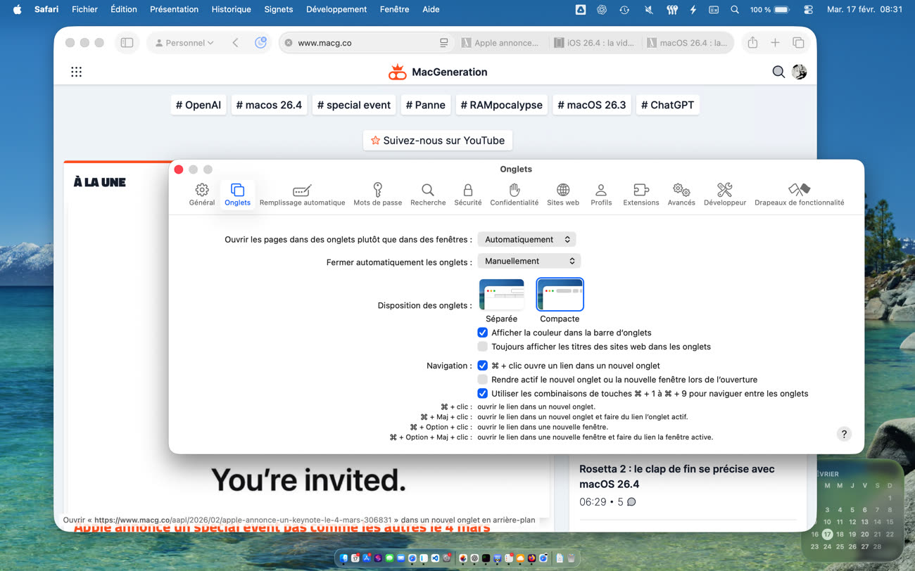 Les bêtas de macOS Tahoe 26.4 et d'iPadOS 26.4, fraîchement déployées, réintroduisent en effet l'option de barre d'onglets compacte. Apple avait fait table rase lors du lancement initial de macOS 26 et iPadOS 26, au grand dam d'une frange d'utilisateurs qui appréciaient ce gain de place vertical et cette fusion entre la barre d'adresse et les onglets.