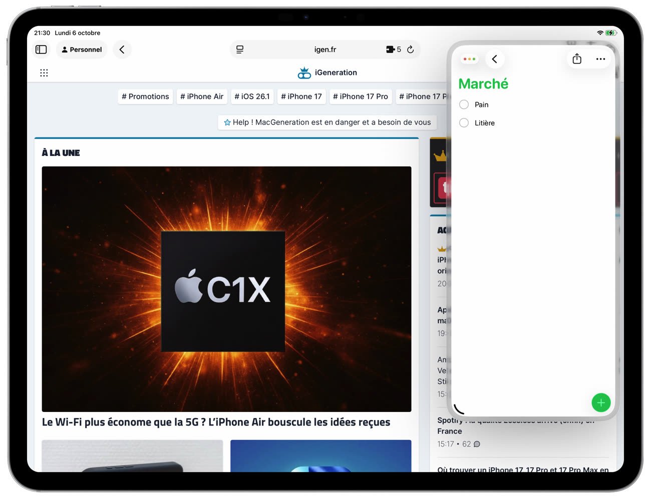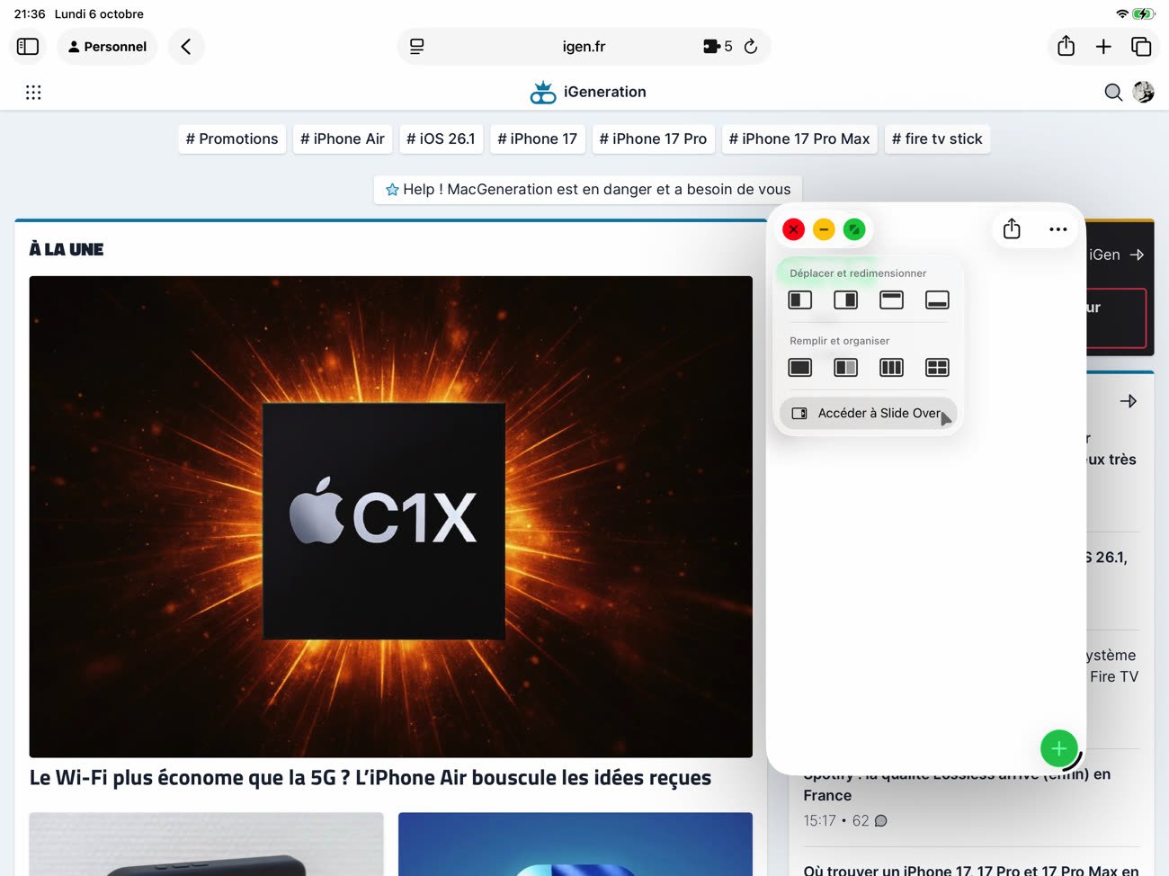 Pour finir, notons que Stage Manager ne gêne pas Slide Over, iPadOS 26 sait gérer les deux en parallèle. Peut-être qu’Apple a prévu d’améliorer encore la fonctionnalité pour l’ajouter même avec les apps en plein écran, on verra si cela change avec les prochaines bêtas d’iPadOS 26.1.