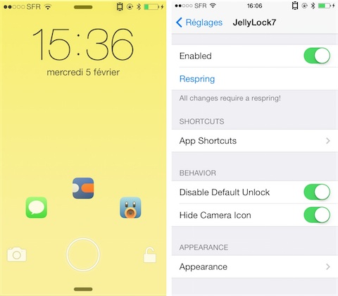 JellyLock 7 est un tweak Cydia permettant de personnaliser son écran de verrouillage. Ressemblant étrangement à ce qui existe sur Android, il propose un accès rapide à ses applications.