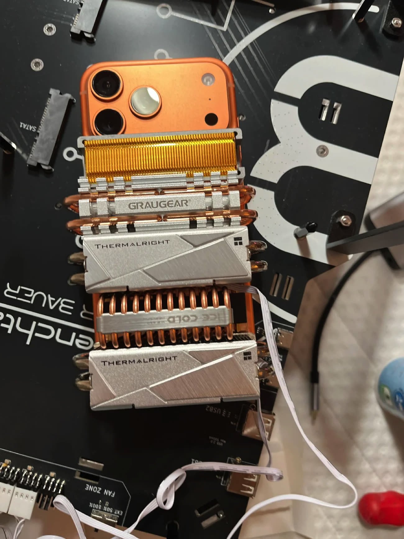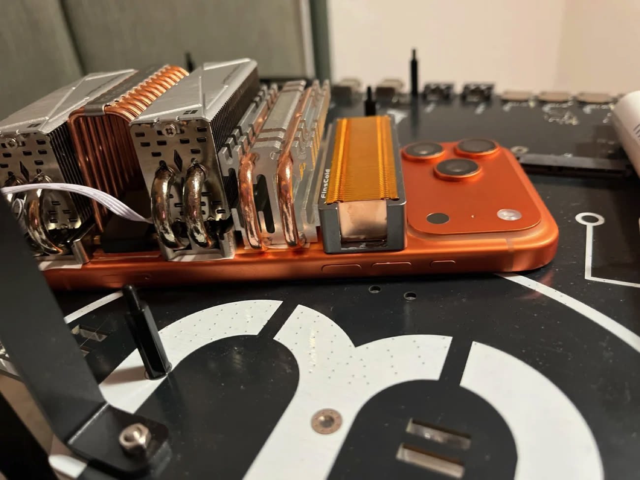 Il a choisi d'installer des dissipateurs de SSD M.2 pour une bonne raison : ils se trouvent facilement et mesurent environ 80 mm de long… c'est-à-dire à peu près la largeur d'un iPhone 17 Pro Max (78 mm). Il a intégré plusieurs modèles différents, mais les modèles équipés de caloducs et de dissipateurs se trouvent entre 10 et 20 € environ. Les caloducs utilisent un principe physique identique à celui des chambres à vapeur (même si le liquide n'est pas nécessairement de l'eau) mais le but n'est pas exactement le même : les chambres à vapeur sont généralement plates et servent à étendre la surface de dissipation, quand les caloducs sont plus souvent employés pour déplacer la chaleur vers les ailettes d'un dissipateur.