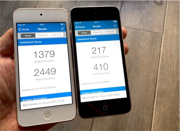 Cela dit, il faut évidemment prendre tout cela avec des pincettes. Le premier test a été réalisé le jour de l’achat du téléphone, alors que l’iPhone devait encore exécuter en arrière-plan ses nombreuses tâches d’indexation et de configuration. En consultant la base de données Geekbench, on observe toutefois la même tendance à la hausse, ce qui suggère que l’amélioration est bien réelle.