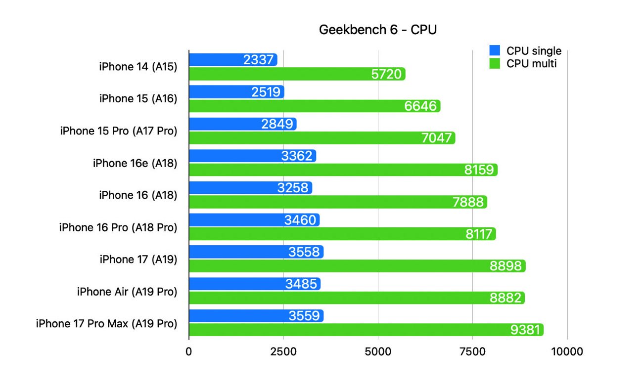 Sur Reddit, un utilisateur a ainsi partagé les scores de son iPhone 17 Pro Max, qui atteignait au lancement 3 510 en single-core et 9 408 en multi-core. Dans notre propre test, nous avions relevé des valeurs très proches : 3 559 et 9 381.