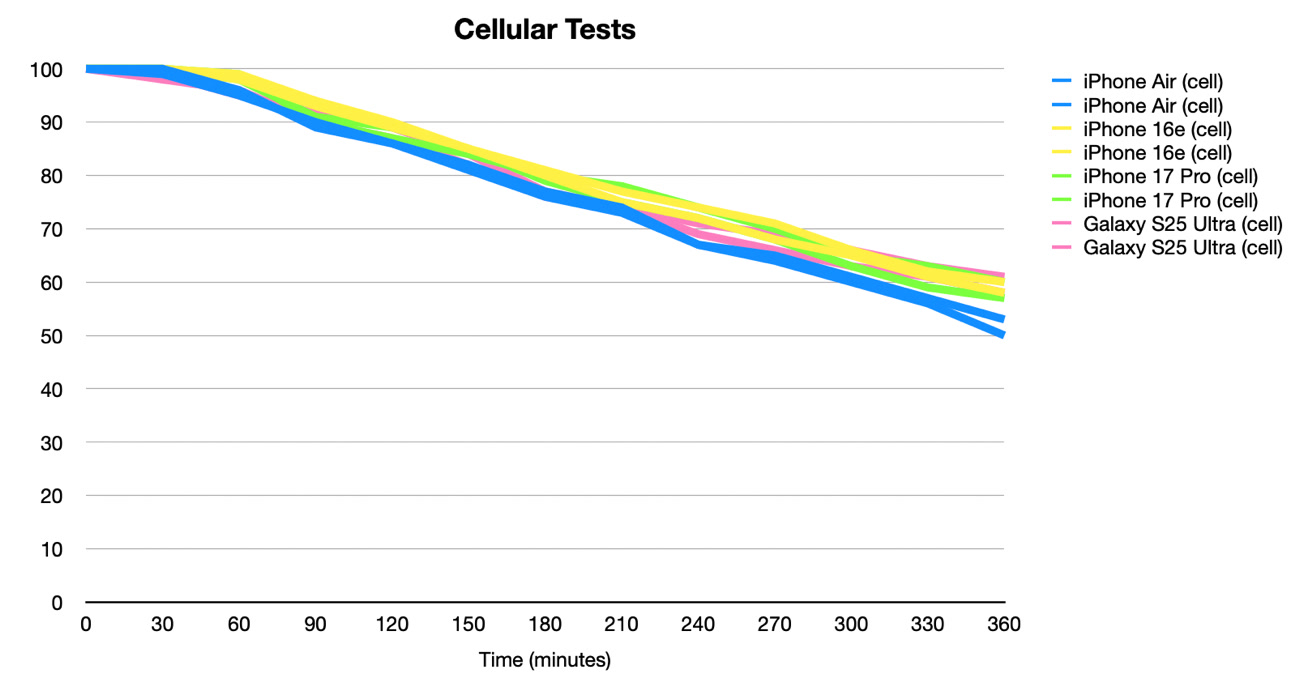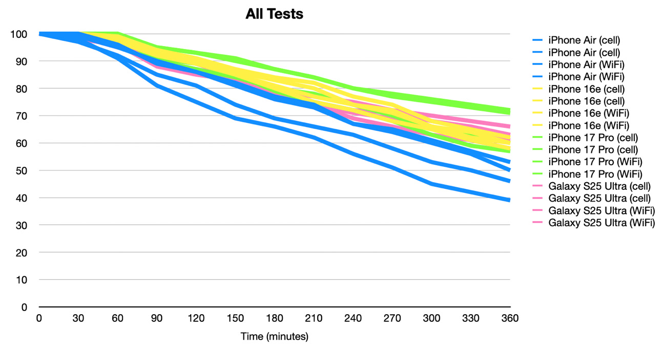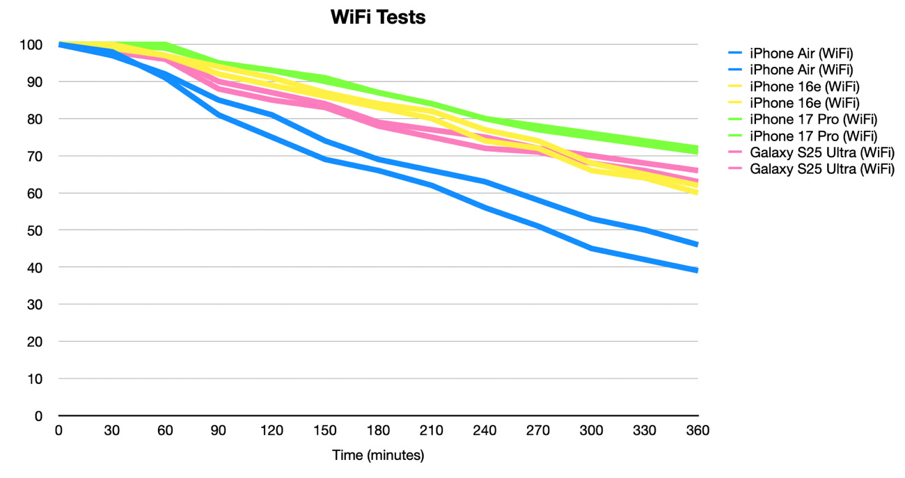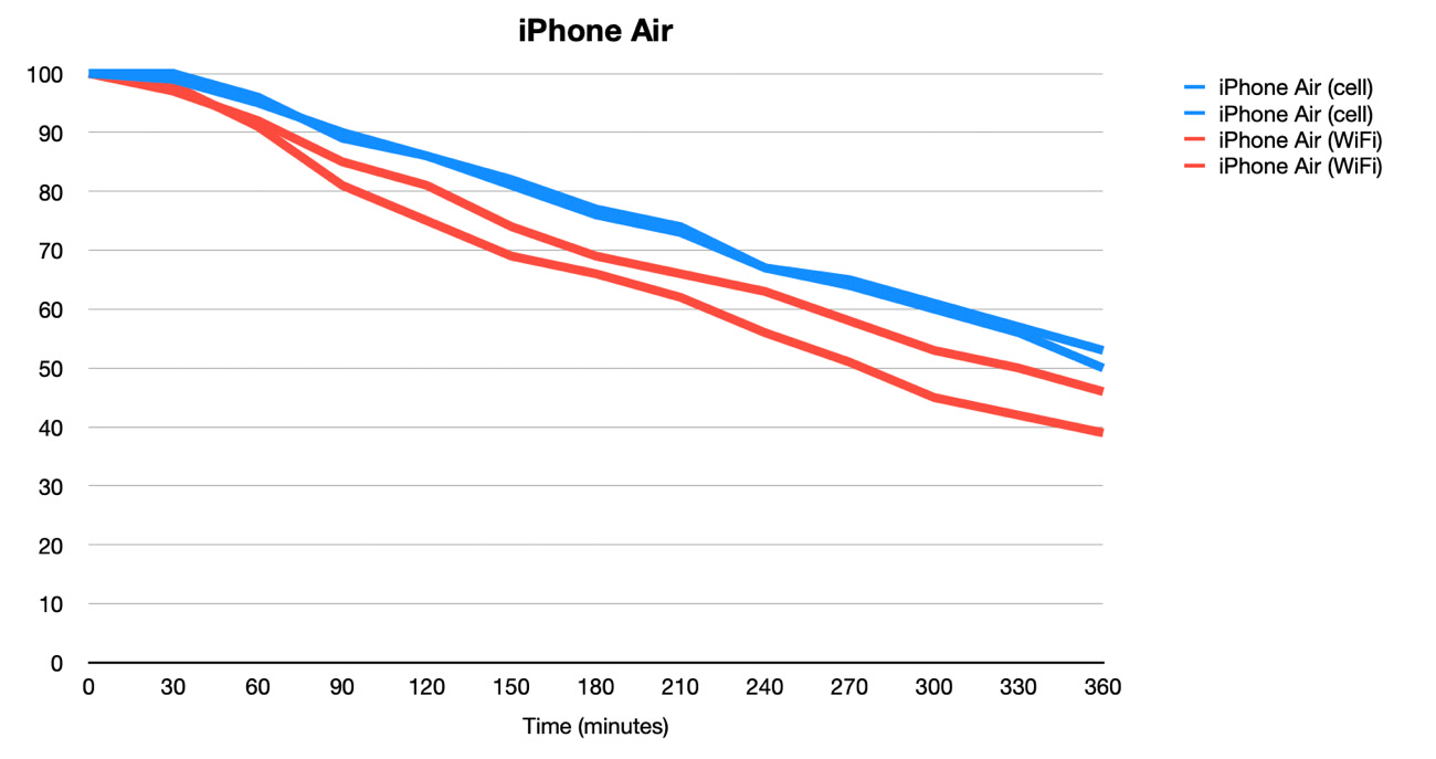 Ce qui est déjà intéressant de remarquer quand on sépare les tests Wi-Fi des tests cellulaires, c'est que la dégradation est nettement moins rapide en 5G qu'en Wi-Fi pour l'iPhone Air. Certes, sa gauge de batterie est plus faible que ses concurrents d'un jour, mais l'écart est nettement moins grand, comme l'attestent les deux tableaux ci-dessous.