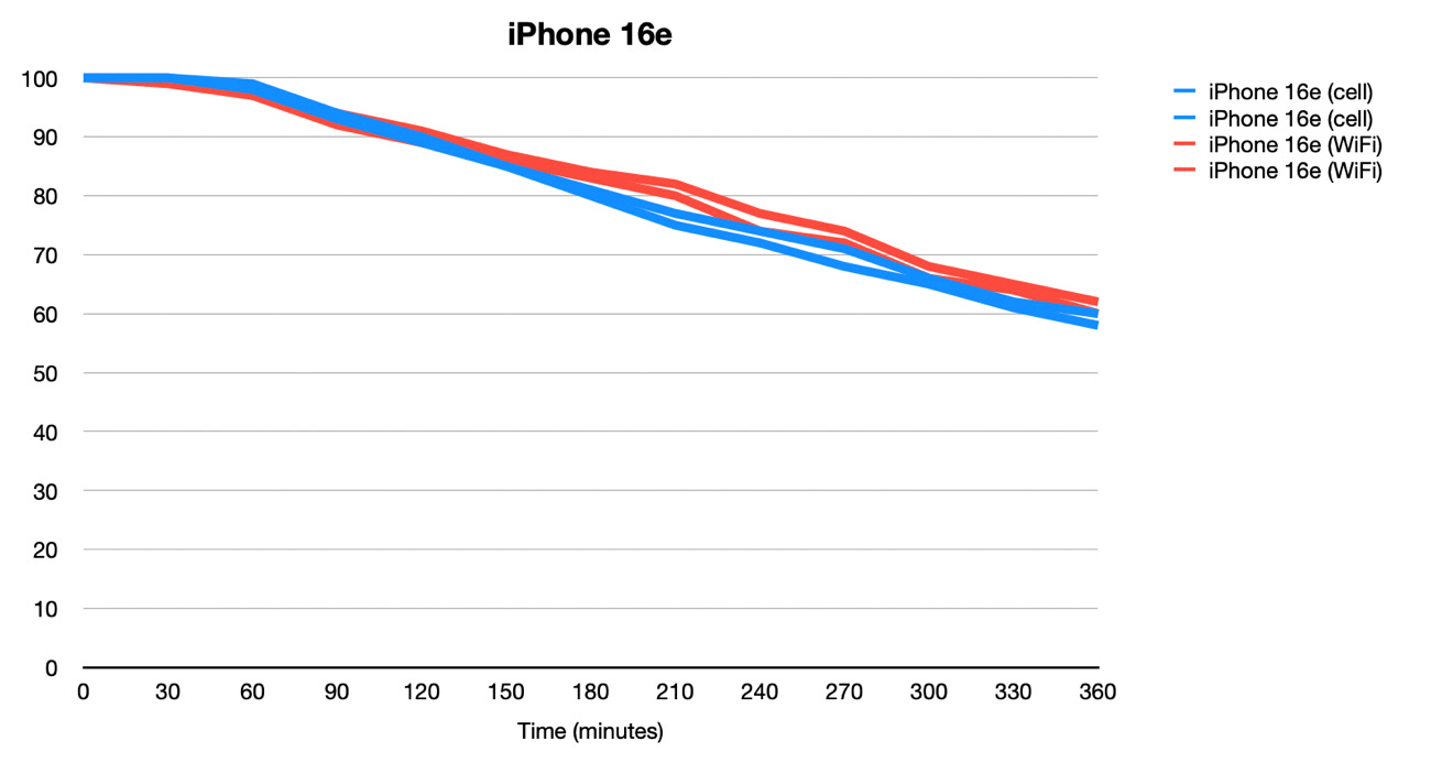 Sans surprise, la dégradation est plus rapide en cellulaire qu'en Wi-Fi. Cela a toujours été comme ça… jusqu'à présent… Comme le montre le tableau ci-dessous, les choses sont assez différentes sur l'iPhone 16e. Les deux courbes se confondent presque, mais c'est encore en Wi-Fi que l'iPhone est le plus économe.