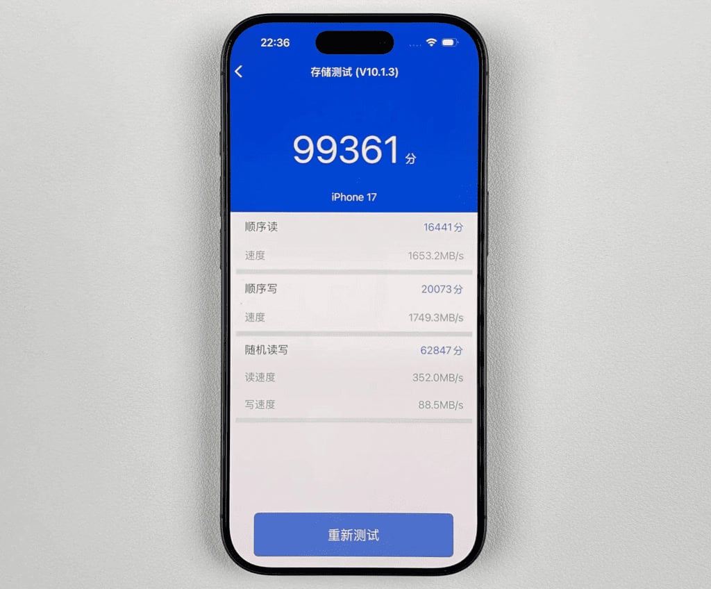 L'iPhone Air ne fait rien comme les autres. Tous les modèles de la gamme affichent des performances similaires en matière de lecture / écriture. Pour mener à bien ses tests, le Youtuber DirectorFeng s'est servi de l'application de bench AnTuTu.