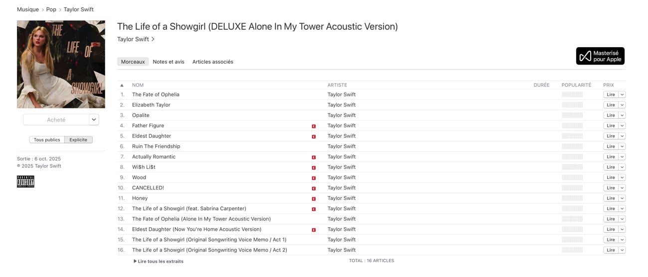 Cette version nommé The Life of a Showgirl (DELUXE Alone In My Tower Acoustic Version) devrait ravir les Swifties avec ses versions acoustiques de certains titres déjà cultes. Pour la chanteuse, c'est un moyen de gagner un peu plus d'argent : même à 6 €, l'album et ses versions acoustiques exclusives rapportent probablement plus d'argent que les lectures en streaming d'une bonne partie de ses fans. Et c'est aussi une mise en avant un peu étonnante sur un service qui a perdu de sa superbe ces dernières années.
