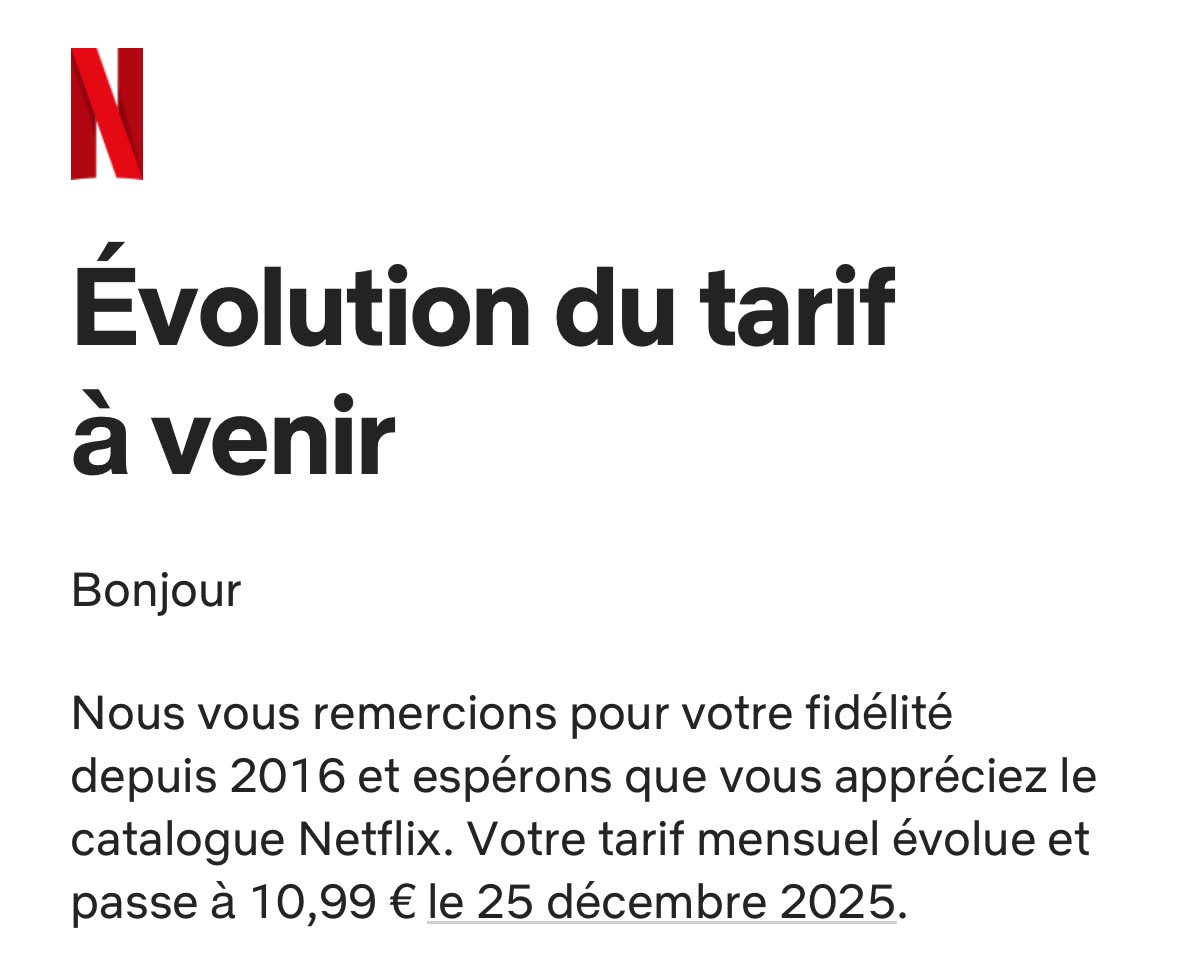 Sale temps pour nos lecteurs belges : Netflix va augmenter ses prix d’ici la fin de l’année. Un de nos lecteurs a reçu un mail l’informant que sa formule Essentiel allait bientôt passer de 10 à 11 €. Le changement sera mis en place à la fin décembre.