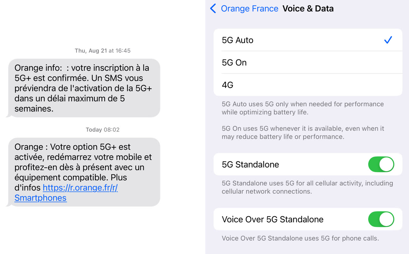 Mise à jour le 2 septembre — S'il fallait encore une preuve que la 5G+ est bien accessible aux clients Multi-SIM d'Orange, la voici : un lecteur ayant demandé l'activation de l'option le 21 août a reçu aujourd'hui la confirmation par SMS. Une nouvelle option 5G Standalone est apparue dans les réglages cellulaires de son iPhone à cette occasion.