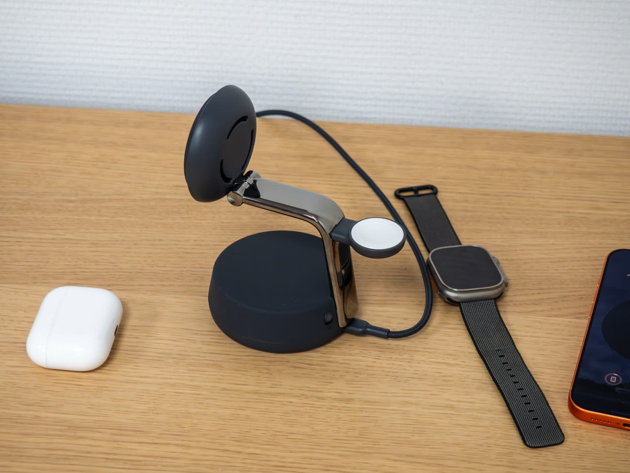 La base est recouverte d’un silicone doux au toucher très agréable. Le chargeur Qi2 est recouvert de la même matière qui ne fait craindre aucune rayure à l’iPhone, contrairement aux chargeurs des Apple Store. Le bras en métal qui porte le galet Apple Watch et le chargeur Qi2 arbore une finition chromée qui renforce l’aspect premium.