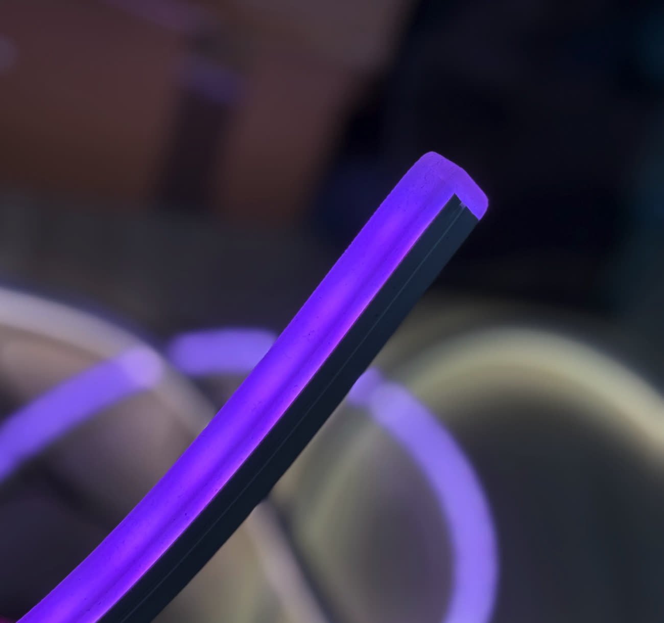 Parlons d'abord de la lumière. Le bandeau se présente sous la forme d'un serpent entouré de caoutchouc. Contrairement aux versions pour l'intérieur, les LED ne sont pas visibles : elles sont derrière une bande en plastique opaque qui va diffuser la lumière. Par rapport à un bandeau classique, on perd d'ailleurs une fonction : il n'est pas possible de le couper à une longueur précise. C'est un compromis lié au fait qu'il doit être étanche (il est IP671). Le bandeau mesure 11 mm pour 21 mm de haut, et la lumière est émise vers le haut, à travers le plastique blanc.